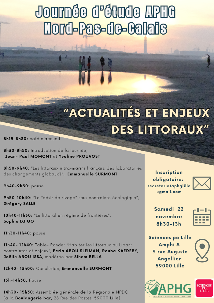 Journée d'étude APHG "Actualités et enjeux des littoraux" Samedi 22 novembre 2025 - 8h30/13h à Sciences Po Lille (amphi A) Programme Inscription obligatoire